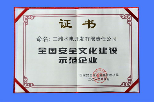 2012年5月9日-10日,國(guó)家安全生產(chǎn)監(jiān)督管理總局在甘肅省金昌市組織召開了2012年全國(guó)安全生產(chǎn)宣傳工作會(huì)議暨安全文化建設(shè)現(xiàn)場(chǎng)會(huì)。會(huì)上,二灘公司被國(guó)家安全生產(chǎn)監(jiān)督管理總局授予“全國(guó)安全文化建設(shè)示范企業(yè)”榮譽(yù)稱號(hào)。