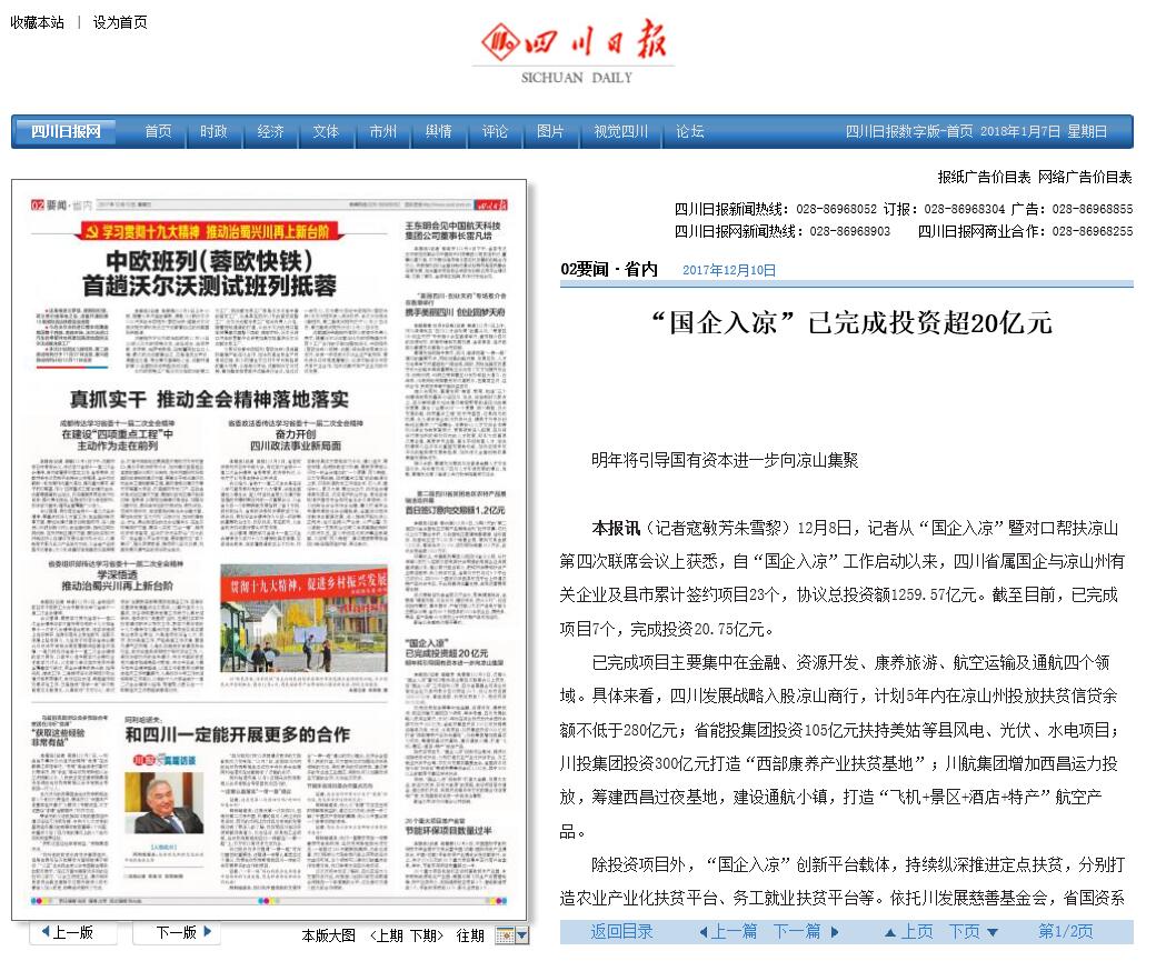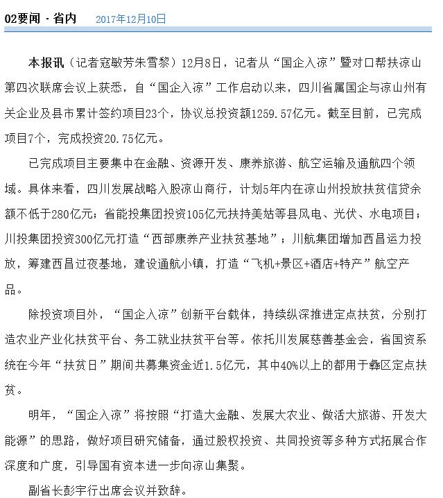 已完成項(xiàng)目主要集中在金融、資源開發(fā)、康養(yǎng)旅游、航空運(yùn)輸及通航四個(gè)領(lǐng)域。具體來看,四川發(fā)展戰(zhàn)略入股涼山商行,計(jì)劃5年內(nèi)在涼山州投放扶貧信貸余額不低于280億元;省能投集團(tuán)投資105億元扶持美姑等縣風(fēng)電、光伏、水電項(xiàng)目;川投集團(tuán)投資300億元打造“西部康養(yǎng)產(chǎn)業(yè)扶貧基地”;川航集團(tuán)增加西昌運(yùn)力投放,籌建西昌過夜基地,建設(shè)通航小鎮(zhèn),打造“飛機(jī)+景區(qū)+酒店+特產(chǎn)”航空產(chǎn)品。
