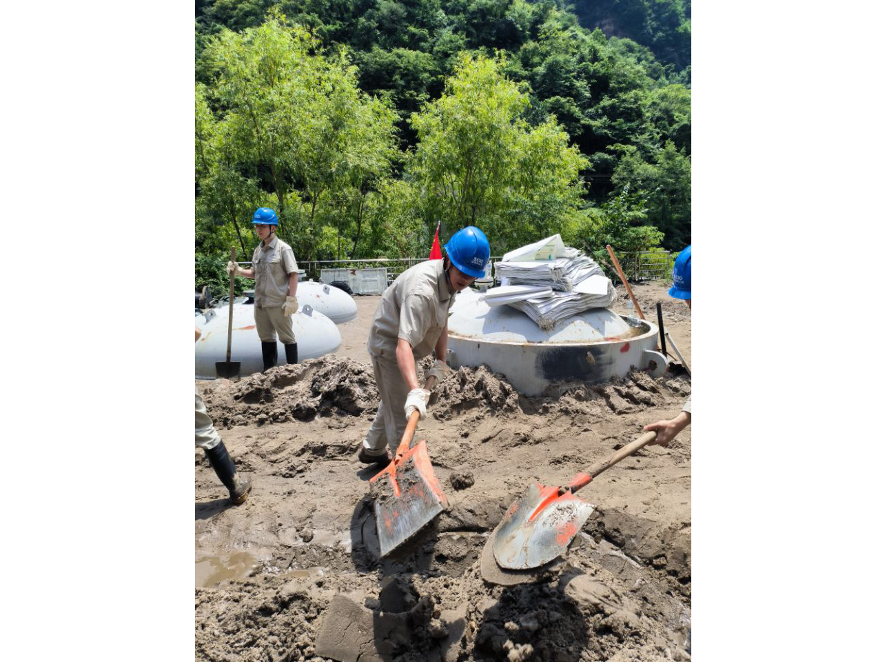 “戰(zhàn)疫保電”的同時(shí),田灣河公司還經(jīng)歷了一次抗險(xiǎn)救災(zāi)考驗(yàn)。8月底,一場(chǎng)大雨裹挾著2萬余方泥石流沖毀了田灣河生產(chǎn)現(xiàn)場(chǎng)通往仁宗海電站的道路與主要線路。為確保安全發(fā)電,基地所有部門悉數(shù)出動(dòng),“白 黑”連續(xù)奮戰(zhàn)搶險(xiǎn)自救。泥濘的滑坡體里,黨員沖鋒在前排查隱患;傾倒的電線桿旁,青年志愿者逐一排查受損情況;被泥水淹沒的庫(kù)房里,黨員突擊隊(duì)全力清淤;廠房里、大壩旁,身處交通孤島的黨員職工們沉著冷靜堅(jiān)持工作。