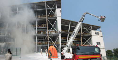 下午三時(shí),烈日當(dāng)空,隨著演習(xí)總指揮劉暢總工的一聲令下,演習(xí)正式開始。精餾工段在巡檢時(shí)發(fā)現(xiàn)三氯氫硅儲(chǔ)罐發(fā)生泄漏并著火燃燒,消防安全應(yīng)急預(yù)案立即啟動(dòng)。撲救初期火災(zāi),切斷儲(chǔ)罐物料,應(yīng)急分隊(duì)集結(jié)待命,受困人員有序撤離進(jìn)入安全區(qū)域。消防官兵接警后迅速趕赴現(xiàn)場(chǎng),當(dāng)班調(diào)度與消防特勤中隊(duì)立即商討并形成了搶險(xiǎn)方案。洗消組、堵漏組、救護(hù)組火速行動(dòng),云梯救援車立即展開,上演高空營(yíng)救緊張的一幕。大火被撲滅,電磁堵漏完成,受困人員成功獲救…