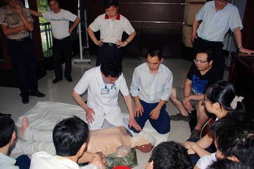培訓會上,謝繼林醫(yī)生結合發(fā)電企業(yè)生產現(xiàn)場發(fā)生的真實案例,采用理論講解、圖示和現(xiàn)場演示相結合的方式,詳細講解了 “最新國際心肺復蘇指南”、“SF6封閉組合電器漏氣及處理措施”、“觸電燒傷及其搶救措施”、“淺部軟組織創(chuàng)傷及其處理”、“熱力燒傷及其處理”、“急性損傷中毒的化學、物理因素及其搶救步驟和原則”等方面的知識,并利用橡皮人進行了模擬救護操作示范。電站現(xiàn)場參培訓人員按照拍、喊、看、摸、聽等步驟,對橡皮人分別進行了單人和雙人胸外按壓、口對口(鼻)人工呼吸救護操作。謝繼林醫(yī)生對操作不規(guī)范的員工認真進行了糾正,直到全部掌握操作要領并通過檢測。