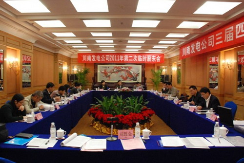 2011年11月16日,四川瀘州川南發(fā)電有限責任公司(以下簡稱公司)2011年第二次臨時股東會、三屆四次董事會在四川成都召開。會議由川投集團公司副總經(jīng)理、公司董事伍康定主持。公司副董事長王文琦,董事郭愛國、張維群、肖群英、李勝章、唐得旗參加會議。監(jiān)事會主席任明霞,監(jiān)事鄭世紅、黃泰慧及公司相關管理人員譚先明、謝偉平、黃松、劉云戈等列席會議。