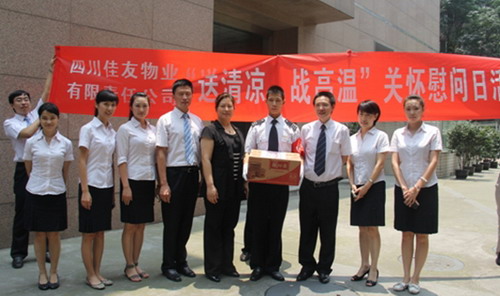7月中旬,已進(jìn)入三伏天氣,夏日炎炎,各地氣溫居高不下。在成都最高氣溫已經(jīng)達(dá)到32℃的炎熱環(huán)境下,佳友物業(yè)的員工們?nèi)匀幻爸崾顖?jiān)守在自己的崗位上。為了表達(dá)公司對(duì)員工的關(guān)懷之情,2012年7月13日中午,公司董事長(zhǎng)穆婷云親自帶隊(duì),總經(jīng)理王賓、總經(jīng)理助理史健陪同,來(lái)到川投物業(yè)服務(wù)中心各一線崗位,為員工們送去夏日的一絲清涼、一絲關(guān)懷。