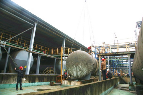 鑒于公司生產(chǎn)設(shè)備停止運轉(zhuǎn)達兩年、生產(chǎn)系統(tǒng)人員大量減少等現(xiàn)實,公司經(jīng)過多次論證,制定了自行處置和外包處理兩種方案,經(jīng)川投集團和川投能源公司審定,同意公司委托有資質(zhì)和經(jīng)驗的廠家對儲罐進行處理。經(jīng)公司多方比選,最后確定讓永祥硅業(yè)公司將2.1.354儲罐運到該公司現(xiàn)場進行處理。永祥硅業(yè)公司積極解決了危險品運輸資質(zhì)、運輸許可以及運輸?shù)缆飞系南嚓P(guān)障礙和問題,雙方合作于2013年10月中旬安全將2.1.354儲罐與公司生產(chǎn)系統(tǒng)管網(wǎng)斷開,為吊裝工作打下了堅實基礎(chǔ)。