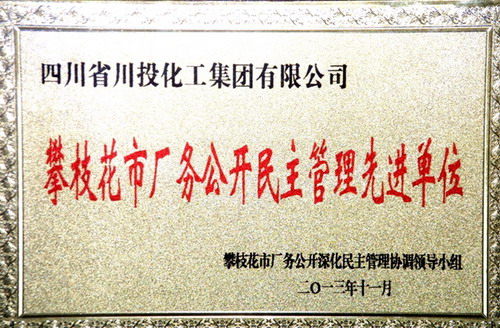 2013年11月26日,攀枝花市廠務(wù)公開民主管理總結(jié)暨推進表彰會在攀枝花市工人文化宮舉行。四川省川投化學(xué)工業(yè)集團有限公司榮獲攀枝花市廠務(wù)公開民主管理先進單位,總經(jīng)理王少甫同志榮獲廠務(wù)公開民主管理先進個人。