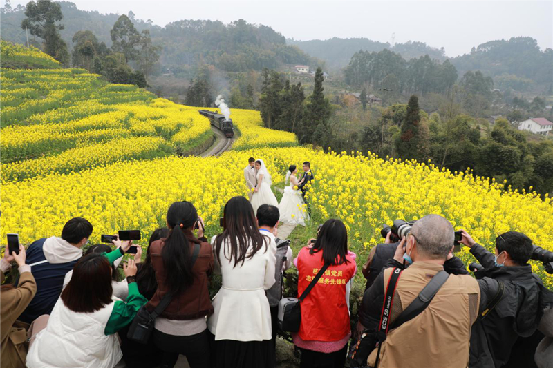 媒體團(tuán)采風(fēng)的第一站是嘉陽(yáng)小火車(chē)躍進(jìn)站,從這里搭乘歷史悠久的窄軌蒸汽小火車(chē),沿著蜿蜒旖旎的芭石鐵路前行,一路欣賞與記錄青山綠水與農(nóng)業(yè)生態(tài)新面貌。在這春意盎然的絕美旅途中,媒體團(tuán)先后在段家灣及亮水沱駐足停留,欣賞小火車(chē)穿越油菜花海與“鐵龍飛虹”的靚麗畫(huà)卷,并為現(xiàn)場(chǎng)的新人伉儷拍攝婚紗照片,共同見(jiàn)證浪漫愛(ài)情。