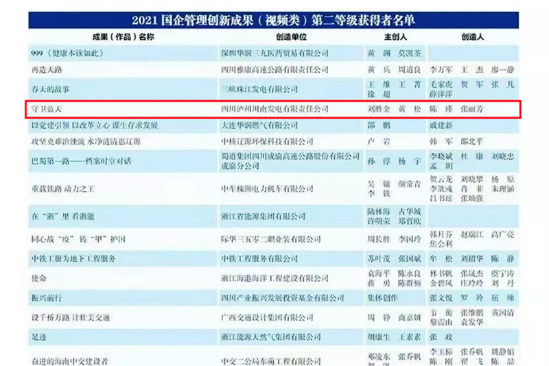 3月26日,由中國企業(yè)管理研究會(huì)、《國企管理》雜志社等聯(lián)合組織開展的“決勝關(guān)鍵之年?展現(xiàn)使命擔(dān)當(dāng)”國企管理創(chuàng)新成果評選揭曉,川南發(fā)電公司創(chuàng)作的《守衛(wèi)藍(lán)天》MV從全國4300多部作品中脫穎而出,獲得“2021國企管理創(chuàng)新成果(視頻類)第二等級”榮譽(yù)稱號。