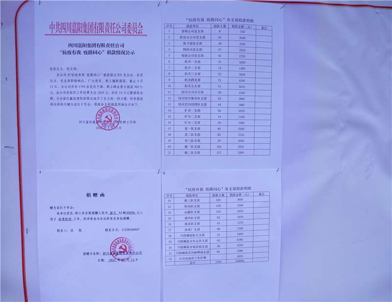 疫情爆發(fā)后,嘉陽集團(tuán)一邊做好自身的疫情管控,一邊發(fā)動(dòng)黨員、志愿者積極支援縣城防疫。公司黨委、工會(huì)在第一時(shí)間發(fā)出了“抗疫有我 疫路同心”捐款倡議,全體黨員和職工積極響應(yīng),發(fā)揚(yáng)“一方有難、八方支援”的精神,通過微信支付、當(dāng)面上交黨支部等不同方式踴躍捐款,助力疫情防控。點(diǎn)滴愛心匯聚汪洋,無私捐助凝聚真情,短短幾天時(shí)間內(nèi),共收到1794人捐款98171元。