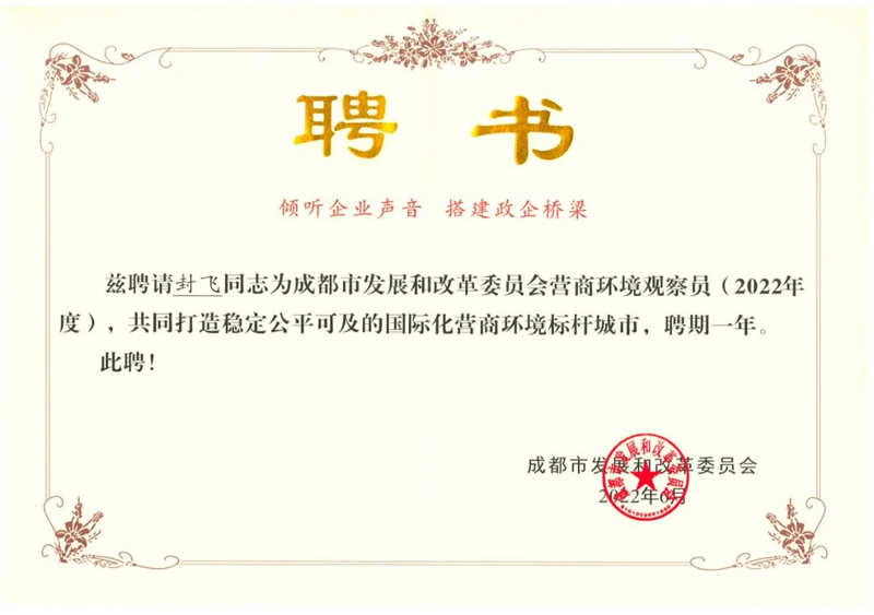 近年來(lái),營(yíng)商環(huán)境水平已成為影響地區(qū)資源聚集能力的重要因素。成都市委市政府高度重視營(yíng)商環(huán)境建設(shè),成都市發(fā)改委按照有關(guān)部署,在各行業(yè)、各領(lǐng)域中通過(guò)初選、公示、審定等程序,最終遴選出一批理論素質(zhì)高、業(yè)務(wù)能力強(qiáng)的營(yíng)商環(huán)境觀察員,川投信息產(chǎn)業(yè)集團(tuán)所屬川投云鏈科技有限公司總經(jīng)理封飛即為其中之一。