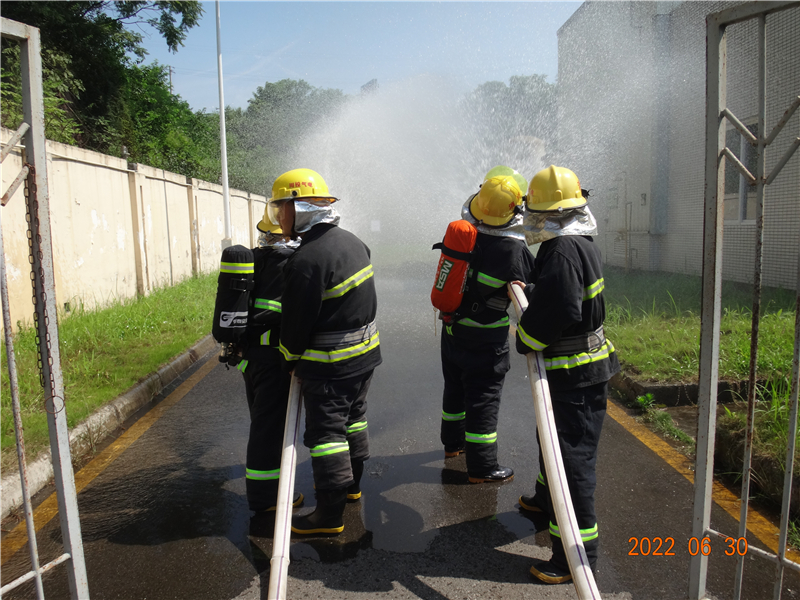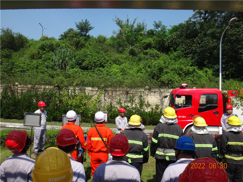 現(xiàn)場(chǎng)演練開(kāi)始后,公司消防人員接到命令快速啟動(dòng)兩臺(tái)消防車攜帶滅火裝備趕赴事故現(xiàn)場(chǎng),使用泡沫水槍對(duì)氫氣儲(chǔ)罐進(jìn)行滅火及降溫,使用散花水槍稀釋空氣中氫氣,整個(gè)過(guò)程協(xié)調(diào)到位,處置得當(dāng),很快將#1儲(chǔ)氫罐著火點(diǎn)撲滅,泄漏點(diǎn)得到控制,現(xiàn)場(chǎng)氫氣濃度符合要求。演練過(guò)程中,各應(yīng)急小組各司其職,迅速行動(dòng),參演人員報(bào)告準(zhǔn)確,應(yīng)急程序符合公司應(yīng)急預(yù)案要求,達(dá)到演習(xí)預(yù)期目的。公司各部門共55人參加了本次演練。