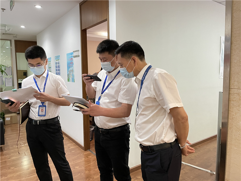 冉蘭平一行首先對川投電力的辦公區(qū)域、公共區(qū)域等關(guān)鍵點(diǎn)位進(jìn)行了檢查,并詳細(xì)查看了防疫物資儲備情況、疫情防控工作臺賬、人員健康登記臺賬,詢問了個別“黃碼”人員和“軌跡重疊”人員的核酸檢測情況和居家辦公情況等。隨后,冉蘭平一行又采取“掃樓”方式,對川投大廈6樓、9樓各辦公室的疫情防控工作落實(shí)情況進(jìn)行逐個督查檢查。