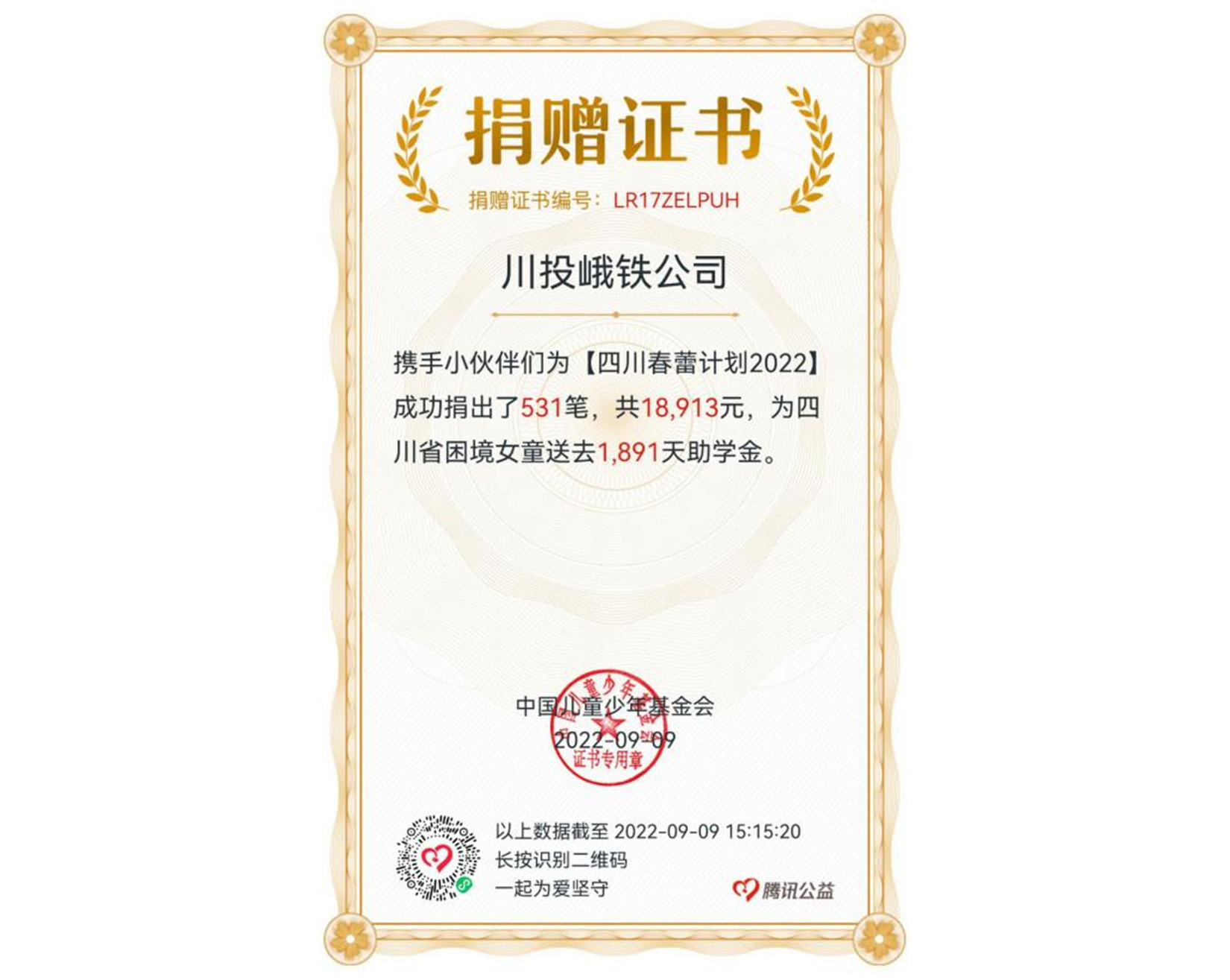 愛獻(xiàn)春蕾、情暖童心。“春蕾計(jì)劃”項(xiàng)目是由全國婦聯(lián)、中國兒童少年基金會(huì)發(fā)起,各級(jí)婦聯(lián)共同參與實(shí)施的公益項(xiàng)目品牌。實(shí)施以來,已幫助數(shù)萬名困境女童重返校園、完成學(xué)業(yè),改變前途命運(yùn),實(shí)現(xiàn)人生蝶變。值此“春蕾計(jì)劃”開展33周年之際,川投峨鐵公司在樂山市國資委的統(tǒng)一領(lǐng)導(dǎo)下,精心策劃,周密部署,下發(fā)了《川投峨鐵公司關(guān)于組織參加樂山國資國企2022年“99公益日——春蕾計(jì)劃”公益項(xiàng)目募捐活動(dòng)的通知》。各二級(jí)單位按照相關(guān)文件通知,組織黨員干部、職工主動(dòng)參與,積極動(dòng)員爭(zhēng)相捐助。至活動(dòng)結(jié)束,共為四川省困境女童送去1891天的助學(xué)金。