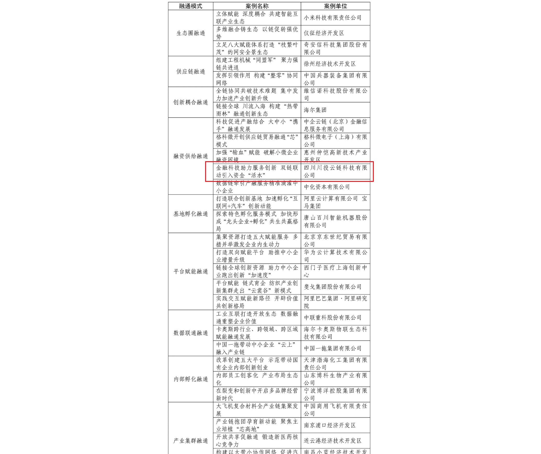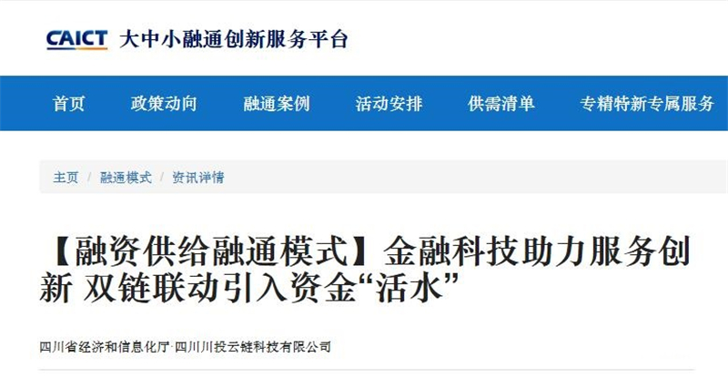 近日,工業(yè)和信息化部聯(lián)合國務(wù)院國資委、全國工商聯(lián)委托中國信通院征集的《大中小企業(yè)融通創(chuàng)新典型模式案例集(2022年)》(簡稱《案例集》)正式發(fā)布。經(jīng)四川省經(jīng)濟(jì)和信息化廳推薦,川投信產(chǎn)所屬川投云鏈公司“金融科技助力服務(wù)創(chuàng)新 雙鏈聯(lián)動引入資金‘活水’”的融資供給融通模式成功入選該案例集,并將在全國范圍內(nèi)推廣。