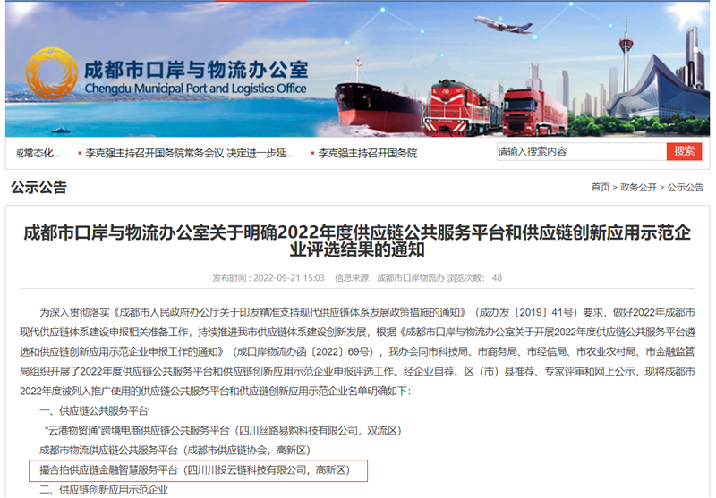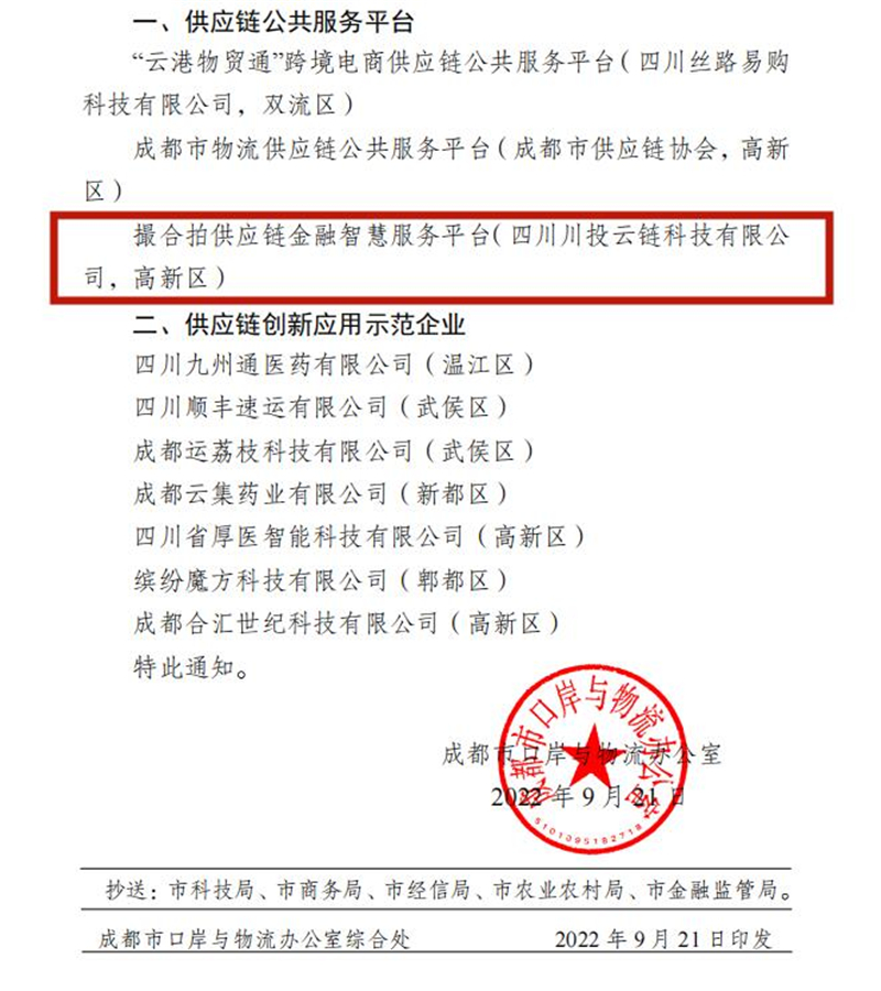 9月21日,成都市口岸與物流辦公室發(fā)布了關(guān)于明確2022年度供應(yīng)鏈公共服務(wù)平臺(tái)和供應(yīng)鏈創(chuàng)新應(yīng)用示范企業(yè)評(píng)選結(jié)果的通知。川投信產(chǎn)所屬川投云鏈公司報(bào)送的“撮合拍供應(yīng)鏈金融智慧服務(wù)平臺(tái)”,在此次評(píng)選中正式獲得了供應(yīng)鏈公共服務(wù)平臺(tái)認(rèn)定,成為成都市3家獲得認(rèn)定的平臺(tái)之一。