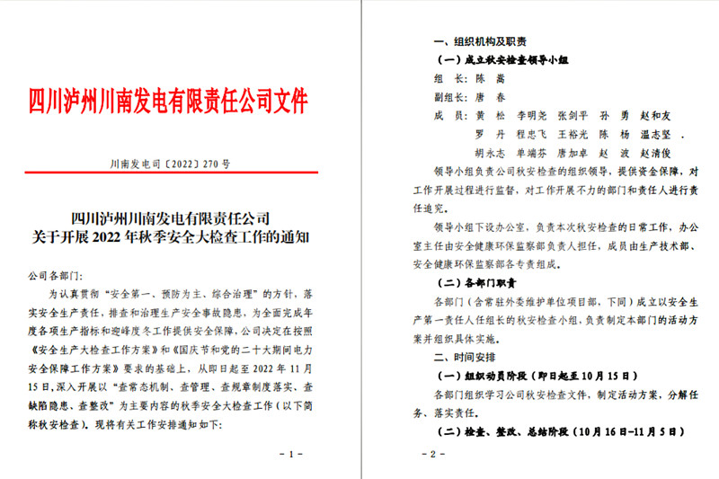 本次秋季安全大檢查成立了以公司黨委副書記、總經(jīng)理任組長的領(lǐng)導(dǎo)小組,對活動提供資金保障,對工作開展過程進行監(jiān)督。活動將在公司范圍內(nèi)對《國慶節(jié)和黨的二十大期間電力安全保障工作方案》進行再落實,對危險化學(xué)品集中治理工作進行階段總結(jié),進一步深入開展有限空間作業(yè)專項整治。在對前期工作“回頭看”的基礎(chǔ)上,對特種設(shè)備管理、機組擴大性小修安全管控、冬季防火、防凍、防小動物等具體工作進行了安排部署,期間穿插開展工作票“三種人”資格認證考試。各部門按照公司統(tǒng)一部署,成立部門安全第一責(zé)任人為組長的活動小組,分解細化活動方案,對標對表開展隱患排查,治理設(shè)備缺陷,確保安全風(fēng)險得到有效管控。