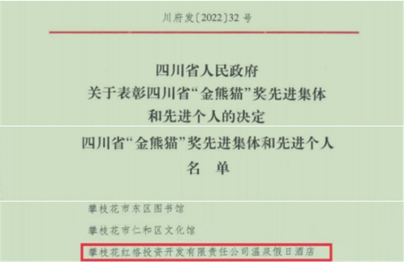 近日,四川省人民政府發(fā)布《關(guān)于表彰四川省“金熊貓”獎先進集體和先進個人的決定》,對全省100個集體和200名個人予以“金熊貓”獎表彰。川投大健康產(chǎn)業(yè)集團所屬攀枝花紅格投資開發(fā)有限責(zé)任公司(以下簡稱紅投公司)紅格溫泉假日酒店(以下簡稱假日酒店)上榜先進集體,抱回一只“金熊貓”。在本次獲獎名單中,飯店性質(zhì)的獲獎單位僅有假日酒店與四川省人民政府金牛賓館兩家獲此殊榮。