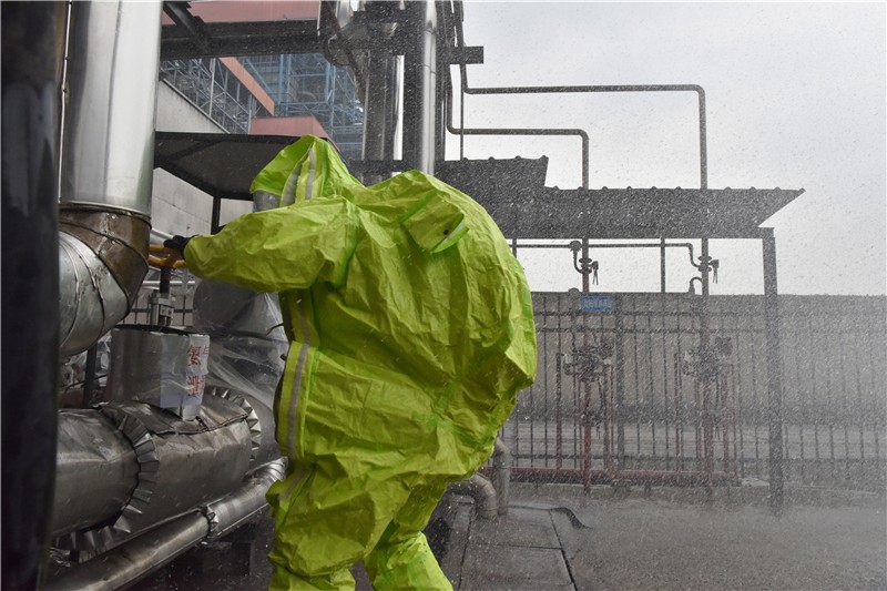 下午14時(shí)30分,演習(xí)正式拉開(kāi)帷幕。根據(jù)演練情景設(shè)置,脫硫運(yùn)行值班室消防噴淋動(dòng)作聲光報(bào)警發(fā)出。監(jiān)盤(pán)主值班員通過(guò)DCS畫(huà)面和視頻監(jiān)控發(fā)現(xiàn)是尿素水解區(qū)尿素水解器A罐噴淋動(dòng)作,立即安排巡檢人員現(xiàn)場(chǎng)查看。巡檢人員到達(dá)現(xiàn)場(chǎng)后,發(fā)現(xiàn)產(chǎn)品氣至1號(hào)機(jī)手動(dòng)關(guān)斷門(mén)盤(pán)根處發(fā)生泄漏,導(dǎo)致鄰近的消防噴淋裝置動(dòng)作,隨即匯報(bào)主值班員。主值班員及時(shí)將現(xiàn)場(chǎng)情況匯報(bào)值長(zhǎng),并安排值班員在保障供氨的情況下適當(dāng)降低產(chǎn)品氣壓力,同時(shí)聯(lián)系設(shè)備維修部機(jī)務(wù)一隊(duì)到現(xiàn)場(chǎng)處理,聯(lián)系消防隊(duì)到尿素水解區(qū)現(xiàn)場(chǎng)降低泄漏點(diǎn)氨氣濃度,協(xié)助保護(hù)檢修作業(yè)人員。設(shè)備維修部機(jī)務(wù)一隊(duì)檢修人員在穿戴好正壓式空氣呼吸器、重型防護(hù)服后,立即開(kāi)展對(duì)產(chǎn)品氣至1號(hào)機(jī)手動(dòng)關(guān)斷門(mén)盤(pán)根的處理工作。同時(shí)其余檢修人員加設(shè)臨時(shí)水泵,將消防噴淋水收集后排進(jìn)積水坑,轉(zhuǎn)運(yùn)至廢水處理系統(tǒng)處置。演練過(guò)程中,參與人員按照演練方案,迅速行動(dòng),檢查、報(bào)告、指揮、救援處置、警戒等各個(gè)環(huán)節(jié)緊張有序。在大家的密切配合下,盤(pán)根處漏點(diǎn)被迅速控制,危險(xiǎn)排除,防止了水解區(qū)氨氣高濃度聚集,甚至影響機(jī)組出口NOX超標(biāo)導(dǎo)致機(jī)組停運(yùn)的危急情況發(fā)生,演練取得圓滿成功。