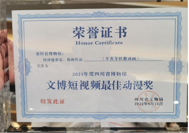游客們打開手機(jī)即可獲取博物館介紹、地理位置、游覽須知等信息,還可在線觀賞精品文物和視頻,通過VR沉浸式云游博物館。項(xiàng)目還通過對(duì)可移動(dòng)文物數(shù)字化成果的活化利用,深挖滎經(jīng)縣博物館的歷史文化遺產(chǎn)資源,建設(shè)了一系列滎經(jīng)縣博物館特色的展示內(nèi)容,踐行了讓文物活起來的使命,受到社會(huì)公眾的一致認(rèn)可。其中,《開善寺社教動(dòng)畫》經(jīng)網(wǎng)絡(luò)投票、專家終評(píng),榮獲2021年度四川省博物館“文博短視頻最佳動(dòng)漫獎(jiǎng)”。