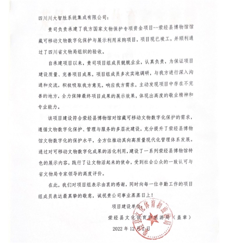近日,由川投信產(chǎn)所屬智勝集成承建的國(guó)家文物保護(hù)專項(xiàng)資金項(xiàng)目——滎經(jīng)縣博物館館藏可移動(dòng)文物數(shù)字化保護(hù)與展示利用采購(gòu)項(xiàng)目順利通過了四川省文物局組織的驗(yàn)收。滎經(jīng)縣文化體育和旅游局特別發(fā)來表?yè)P(yáng)信,對(duì)項(xiàng)目成果給予了高度肯定,向項(xiàng)目組成員的專業(yè)能力和敬業(yè)精神表示了敬意。