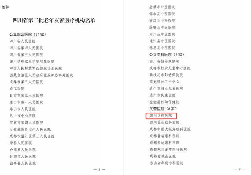 1月3日,四川省衛(wèi)生健康委員會(huì)下發(fā)《關(guān)于認(rèn)定四川省第二批老年友善機(jī)構(gòu)名單的通知》(川衛(wèi)老齡函〔2022〕248號(hào)),四川口腔醫(yī)院成功獲批“四川省第二批老年友善醫(yī)療機(jī)構(gòu)”稱號(hào)。