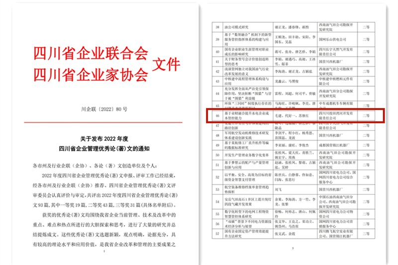 近日,四川省企業(yè)聯(lián)合會、四川省企業(yè)家協(xié)會公布了2022年度四川省企業(yè)管理現(xiàn)代化創(chuàng)新成果和優(yōu)秀論著文評審結(jié)果,田灣河公司《基于業(yè)財融合提升水電企業(yè)成本管控能力》獲得2022年度四川省企業(yè)管理優(yōu)秀論(著)文二等獎。