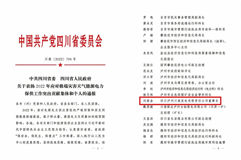 近期,中共四川省委、四川省人民政府發(fā)布了《關(guān)于表揚(yáng)2022年應(yīng)對極端災(zāi)害天氣能源電力保供工作突出貢獻(xiàn)集體和個(gè)人的通報(bào)》,公司黨委書記、董事長劉勝金同志獲省委省政府“2022年應(yīng)對極端災(zāi)害天氣能源電力保供工作突出貢獻(xiàn)個(gè)人”通報(bào)表揚(yáng)。