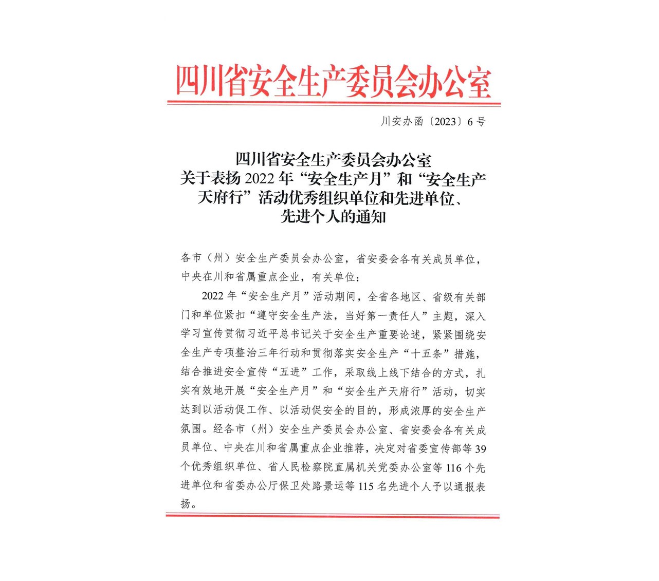 去年“安全生產(chǎn)月”活動期間,全省各地區(qū)、省級有關(guān)部門和單位深入學(xué)習(xí)宣傳貫徹習(xí)近平總書記關(guān)于安全生產(chǎn)重要論述,扎實有效地開展“安全生產(chǎn)月”和“安全生產(chǎn)天府行”活動。經(jīng)過各市(州)安全生產(chǎn)委員會辦公室、省安委會各有關(guān)成員單位、中央在川和省屬重點企業(yè)推薦,決定對包括宏明電子在內(nèi)的全省116個先進單位予以通報表揚。