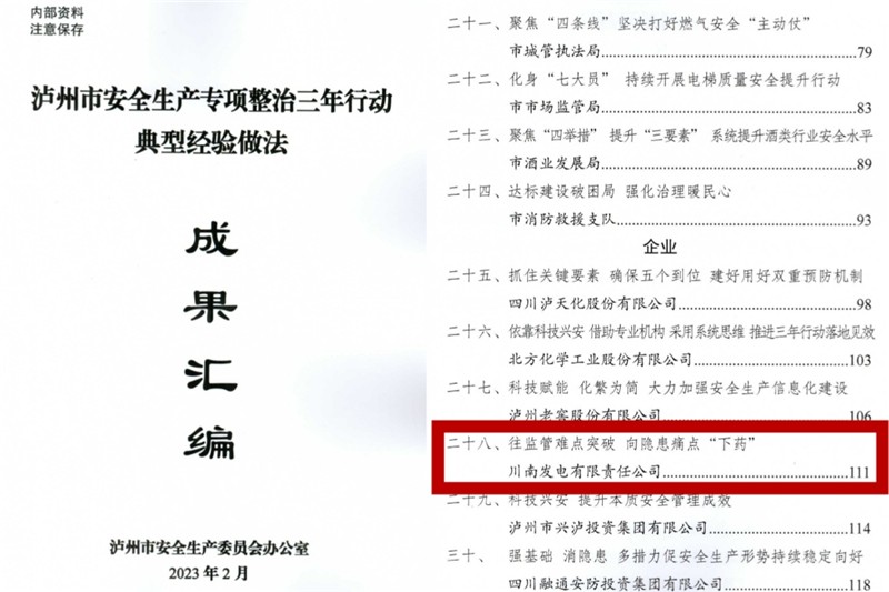 2月7日,在瀘州市2023年安全生產(chǎn)、應(yīng)急管理、防災(zāi)減災(zāi)、森林防滅火工作會上,瀘州市安全生產(chǎn)委員會發(fā)布了《瀘州市安全生產(chǎn)專項整治三年行動典型經(jīng)驗做法成果匯編》,公司安全生產(chǎn)專項整治三年行動工作的經(jīng)驗做法成功入選。