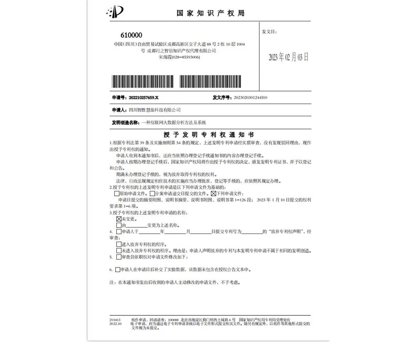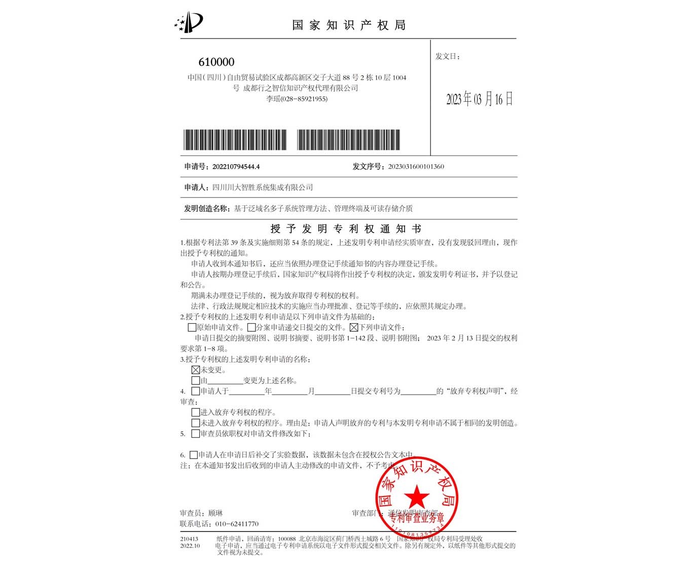 近日,川投信產(chǎn)所屬智勝集成收到來自國家知識產(chǎn)權(quán)局的兩份發(fā)明專利授權(quán)通知,兩項技術(shù)分別為“基于泛域名多子系統(tǒng)管理方法、管理終端及可讀存儲介質(zhì)”和“一種互聯(lián)網(wǎng)大數(shù)據(jù)分析方法及系統(tǒng)”。