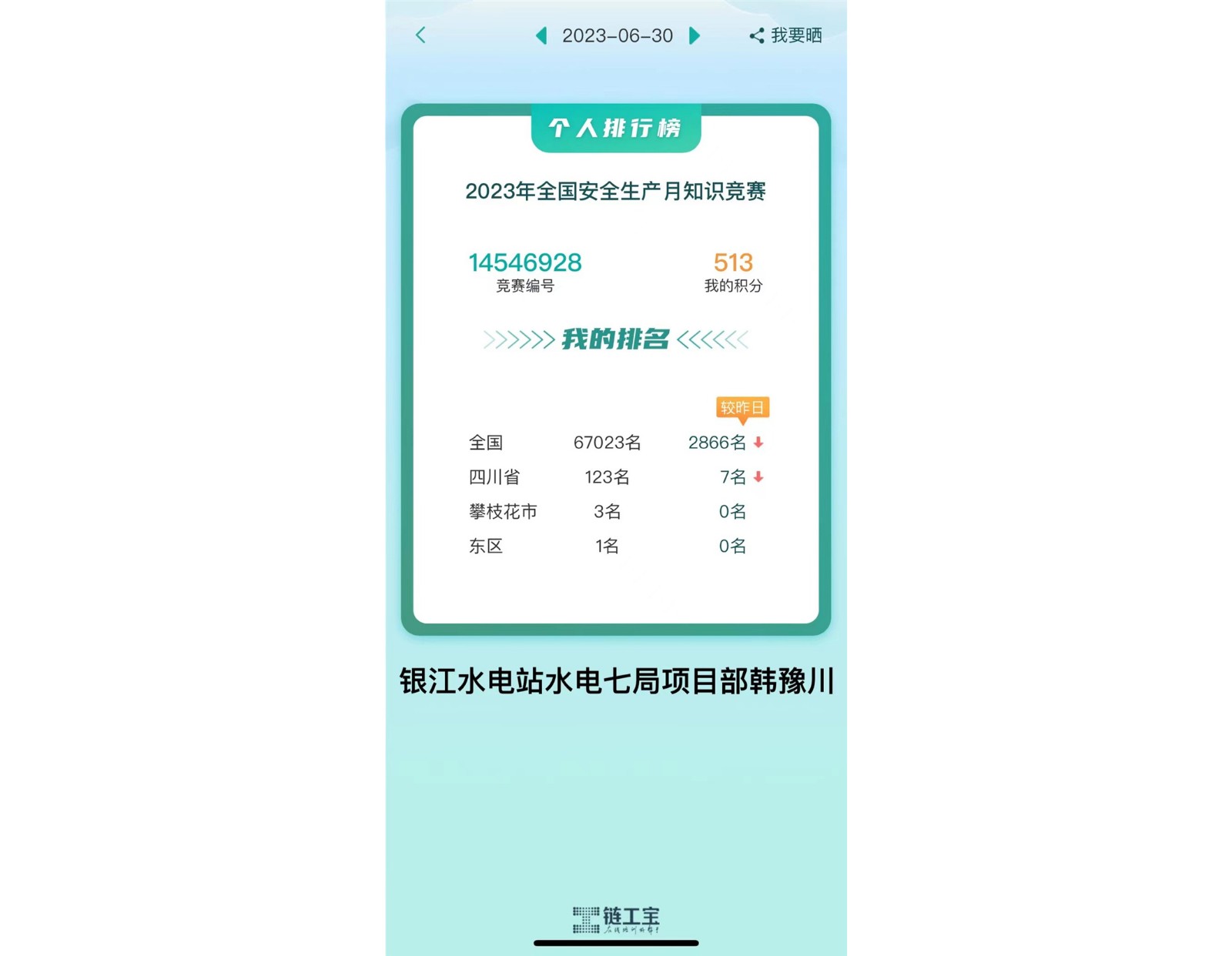 在“鏈工寶”2023年全國(guó)安全生產(chǎn)月知識(shí)競(jìng)賽活動(dòng)中,攀枝花市前10名中,銀江水電站占3人,東區(qū)前10名中,銀江水電站占6人,有效檢驗(yàn)了安全生產(chǎn)月活動(dòng)成果,充分體現(xiàn)了銀江水電站學(xué)安全、講安全的濃厚安全生產(chǎn)氛圍,進(jìn)一步強(qiáng)化了廣大工程參建人員的安全生產(chǎn)意識(shí)。