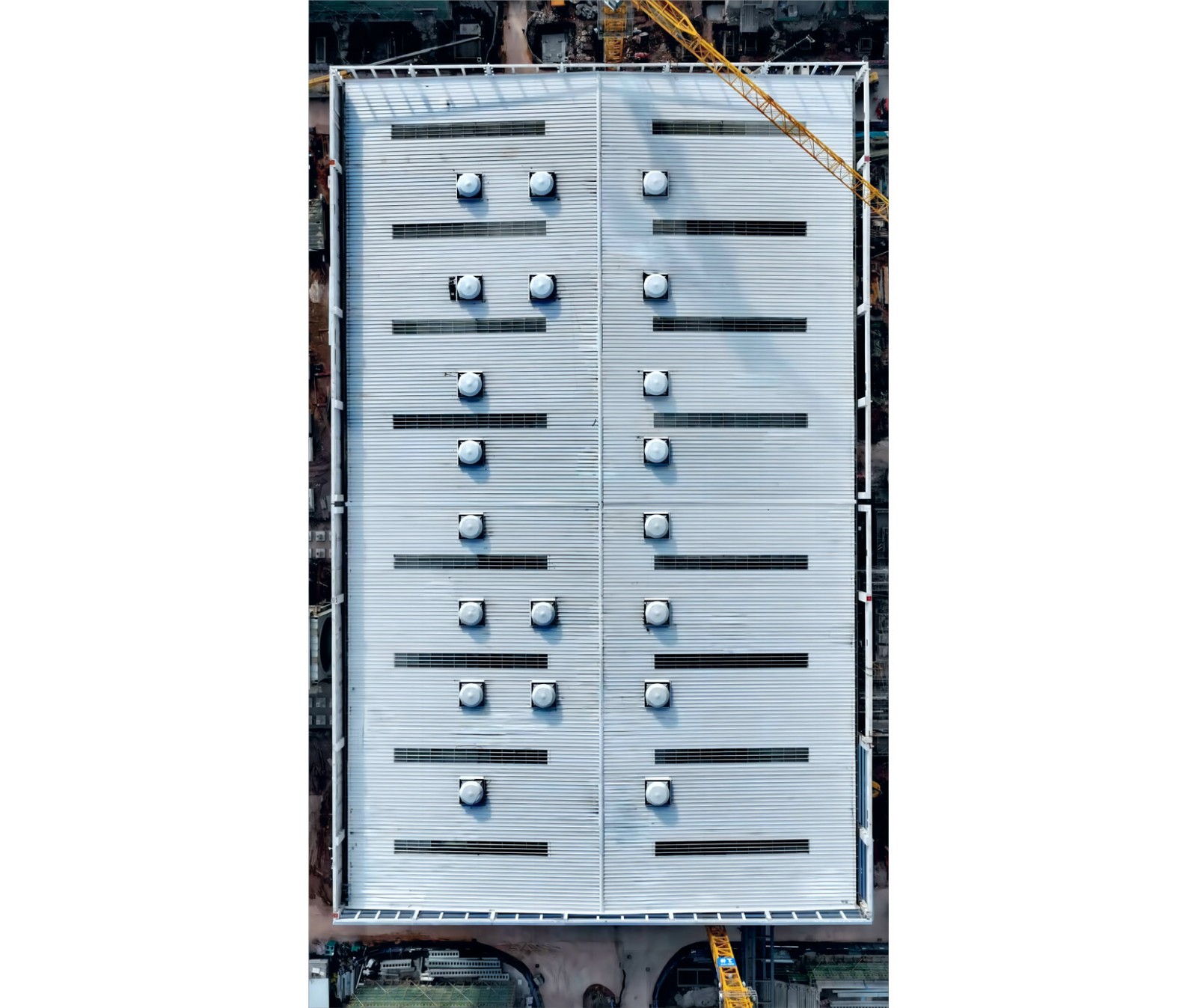 資陽(yáng)燃?xì)怆娬局鲝S房屋面鋪設(shè)在標(biāo)高31.65m的網(wǎng)架上,屋面共分5層安裝,包括底板、防水布、保溫、TPO防水膜和頂板,屋面上安裝20臺(tái)風(fēng)機(jī)滿(mǎn)足主廠房通風(fēng)。為確保按時(shí)完成止水節(jié)點(diǎn)目標(biāo),公司與EPC總承包設(shè)備采購(gòu)單位、施工單位召開(kāi)專(zhuān)項(xiàng)協(xié)調(diào)會(huì),提前編制網(wǎng)架安裝方案和應(yīng)急預(yù)案并通過(guò)專(zhuān)家審查,成立屋面止水工作專(zhuān)班,統(tǒng)籌協(xié)調(diào)材料、設(shè)備、施工,嚴(yán)格落實(shí)安全措施和應(yīng)急物資,狠抓過(guò)程控制。同時(shí),資陽(yáng)氣電公司、項(xiàng)目監(jiān)理部圍繞安全、質(zhì)量、進(jìn)度三個(gè)核心要素,落實(shí)責(zé)任人,全過(guò)程跟蹤,有力確保主廠房全面止水里程碑節(jié)點(diǎn)目標(biāo)高質(zhì)量完成,為燃機(jī)、汽機(jī)、發(fā)電機(jī)等主設(shè)備安裝創(chuàng)造了良好條件。