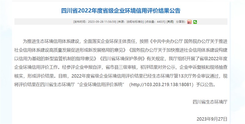 近日,四川省生態(tài)環(huán)境廳公布了2022年度企業(yè)環(huán)境信用評價結(jié)果,公司再次喜獲“環(huán)保誠信企業(yè)”榮譽稱號,這是公司連續(xù)第6年獲此殊榮。