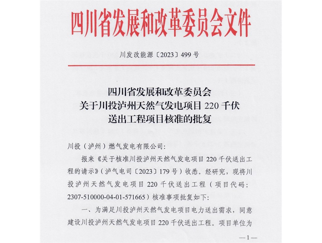 10月7日,川投瀘州天然氣發(fā)電項(xiàng)目220千伏送出工程項(xiàng)目取得四川省發(fā)展和改革委員會(huì)的核準(zhǔn)批復(fù),正式進(jìn)入國(guó)家行政許可建設(shè)流程。